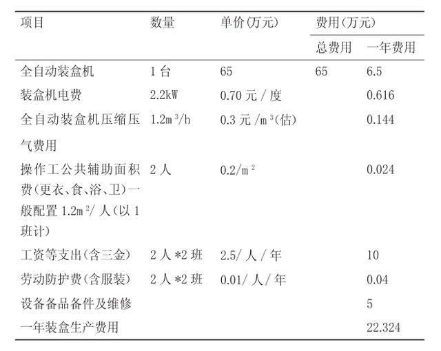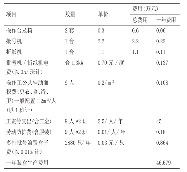 傳統(tǒng)手工裝小盒包裝的產(chǎn)量為60支/min(數(shù)據(jù)來源于某制藥廠軟膏車間),一般需4人/班完成(含折說明書和批號(hào)打?。?,若以生產(chǎn)速度120支/min為例,另加1人輔助,則裝小盒工作需9人/班完成,以2(班/天)計(jì)算,則一年軟膏劑裝小盒的生產(chǎn)費(fèi)用,如下圖所示,其中設(shè)備以10年折舊,建筑以20年折舊,工作日250天/年,8h/班計(jì)算。