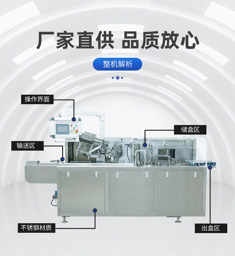 產品概述:機身采用304不銹鋼,干凈整潔,耐腐蝕。前端配置大型物料倉,便于工人拿取。采用自動開(吸)盒,人工擺料,進料,封盒,檢測剔廢等工序,運行平穩(wěn),噪音低。